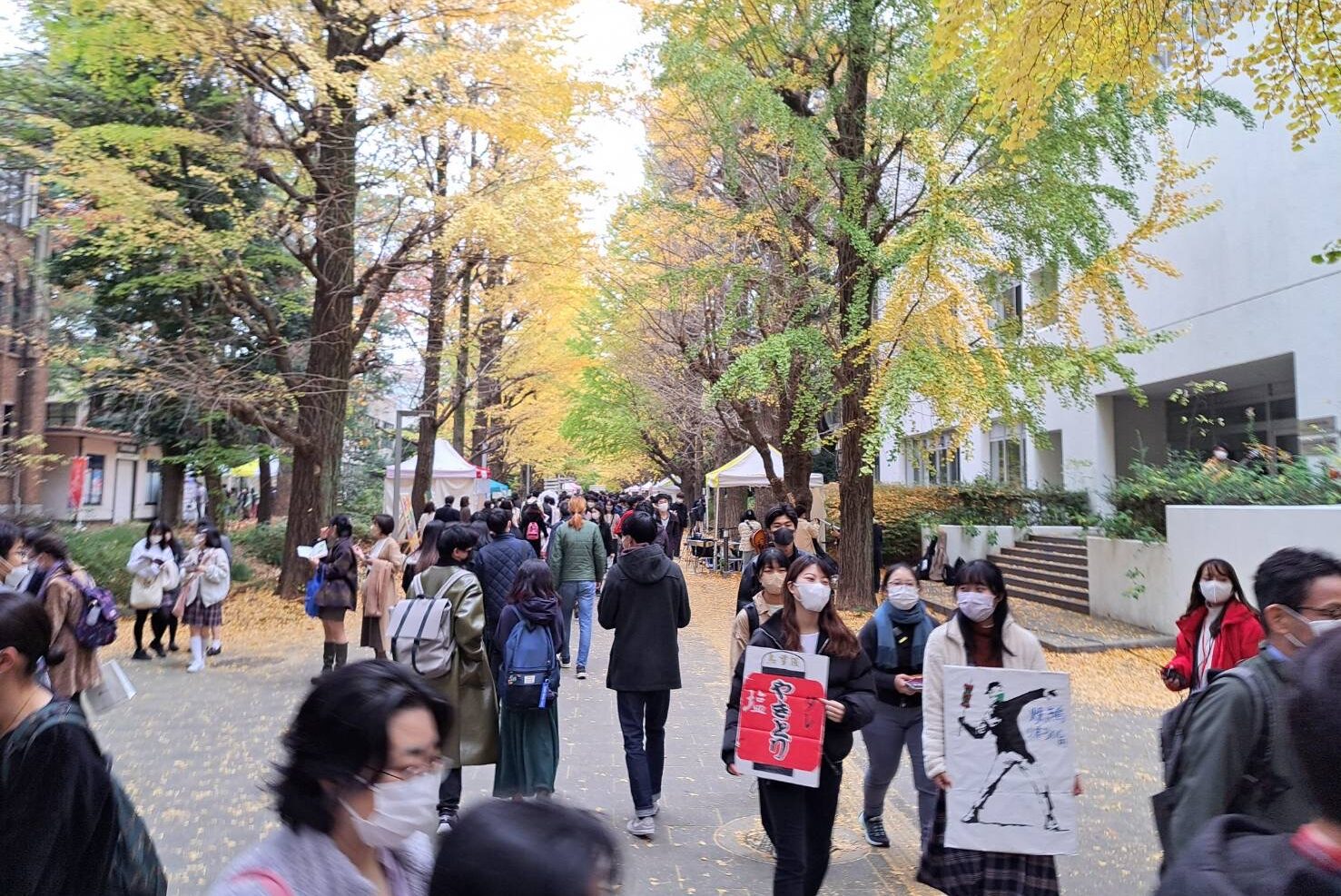 受付後最初に出会うのは銀杏並木沿いのテント列。どのお店もそれぞれの魅力があり、見ているだけで楽しいですね。ちょうど紅葉シーズンと重なる駒場祭では、この銀杏並木も見所の一つです。