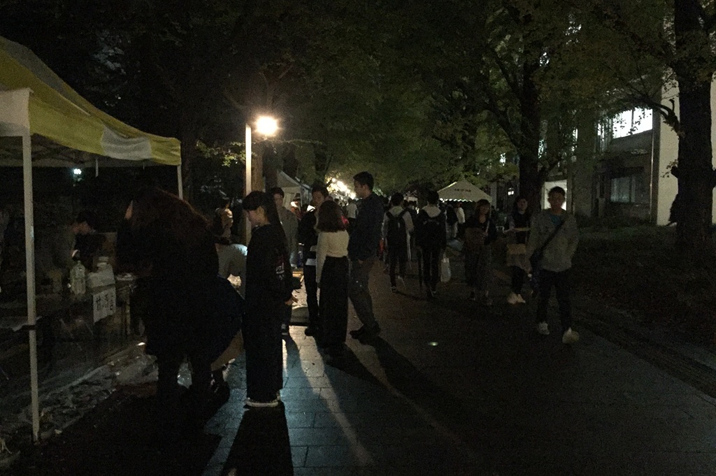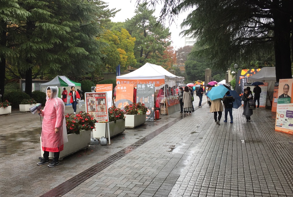 雨に濡れる駒場の銀杏並木には、傘を差した人々が行き交い、歩道は賑わいを見せていました。あいにくの天気にもかかわらず、銀杏並木そのものが祭の舞台を彩っていました。また、グッズ売り場は次々と訪れる来場者であふれ、活気に満ちていました。
