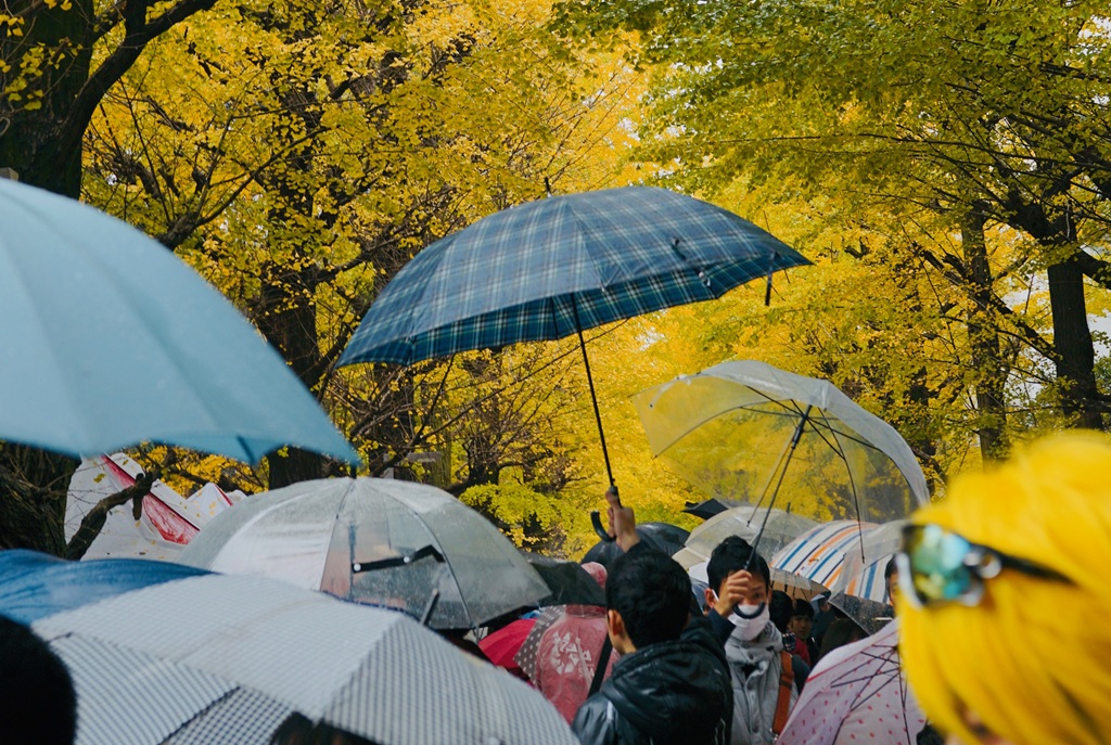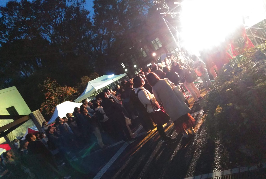 あたりが暗くなり始めても、目抜き通りのイチョウ並木はには人の往来が続いていました。雨に包まれたいちょうステージでは、降りしきる雨が暗さを増す一方で、照明に照らされた舞台がまるで発光しているかのように幻想的な光景を生み出していました。その輝きに引き寄せられるように観客が集まり、雨と光が織りなす独特の雰囲気の中で、最後まで人々を魅了し続けていました。